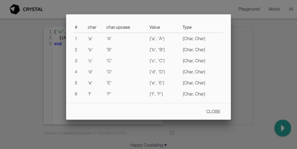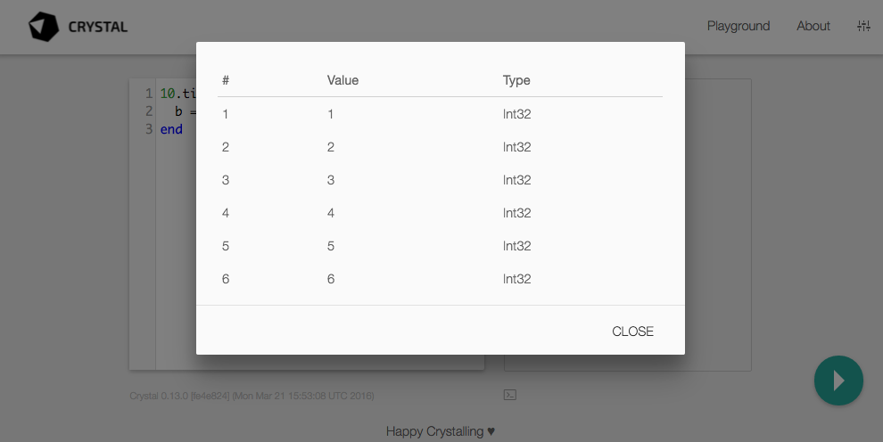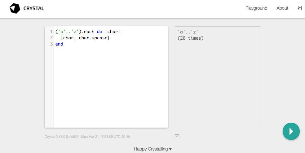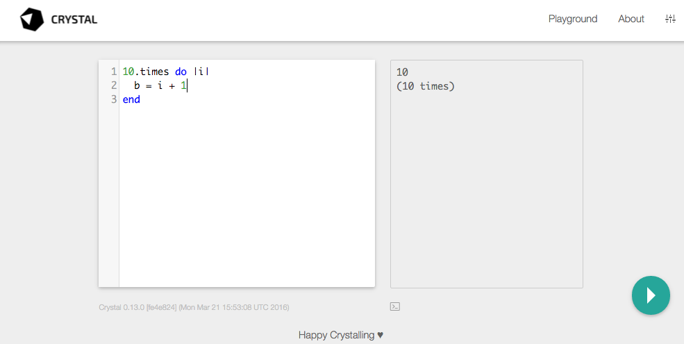 Section titled The PlaygroundThe new playground is an excellent way to try ideas, test code, understand its execution, and teach Crystal to others.